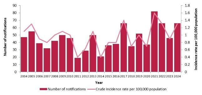 Number of hepatitis A notifications and notification rate per 100,000 population, 2004-2024